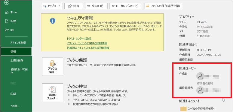 Excelファイルを開いて確認してみましょう。「情報」タブの関連ユーザーの「作成者」と「最終変更者」が削除されています。