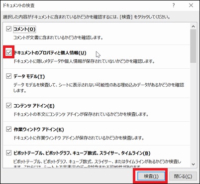 「ドキュメントのプロパティと個人情報」にチェックが入っている事を確認して、「検査」ボタンを押します。