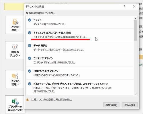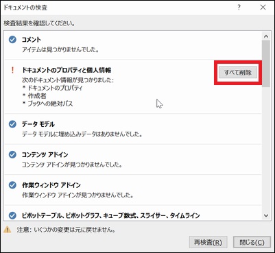 しばらくすると検査結果を表示されます。「ドキュメントのプロパティと個人情報」の所に ! マークが付きます。「すべて削除」ボタンを押せば、作成者の情報を削除してくれます。