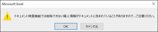 上書き保存をすると、上記のようなメッセージが表示されます。Excelシート上などに記録された個人情報などは、対象となっていませんので注意してください。