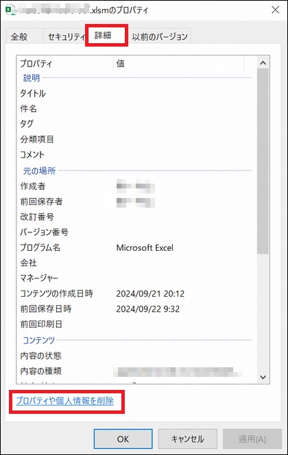 下図のように「詳細」タブをクリックすると、プロパティ一覧が出てきます。下にある「プロパティや個人情報を削除」をクリックします。