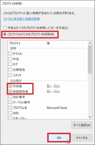 以下のように、「このファイルから次のプロパティを削除」をマークして、下のプロパティから、「作成者」と「前回保存者」にチェックを入れて「OK」を押します。